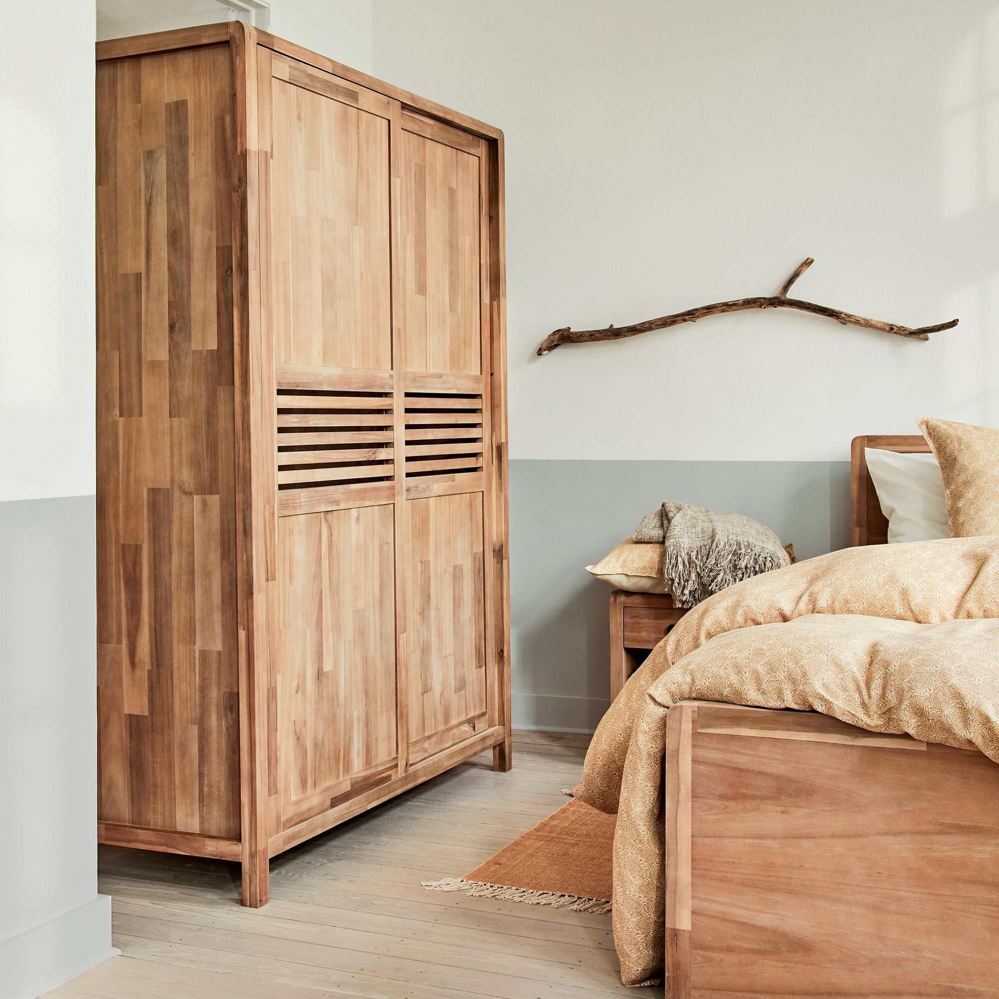 GAIA - Armoire 2 portes coulissantes en acacia massif H203cm - bois clair