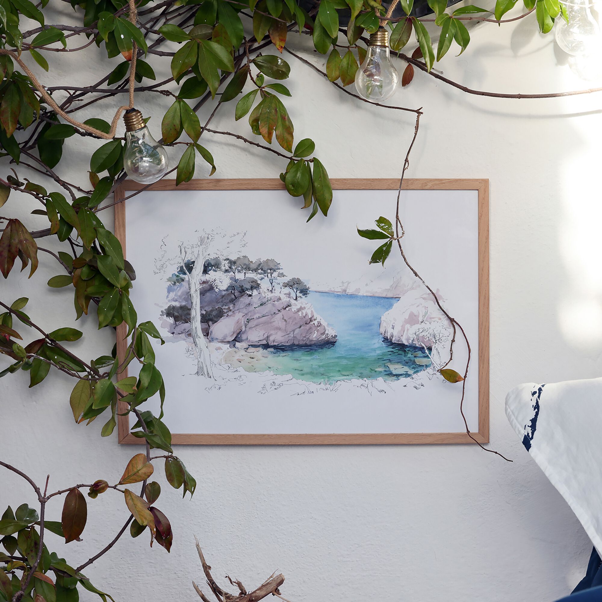 KALANCA - Aquarelle encadrée crique 38x53cm - bleu
