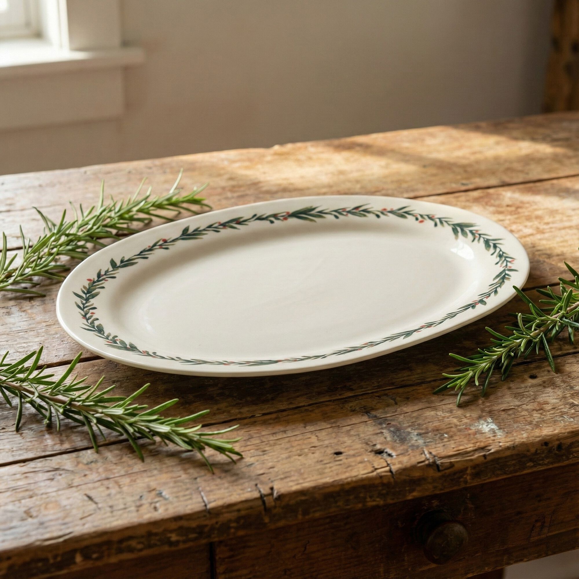 HOUX - Plat ovale avec motif houx en grès L40cm - blanc