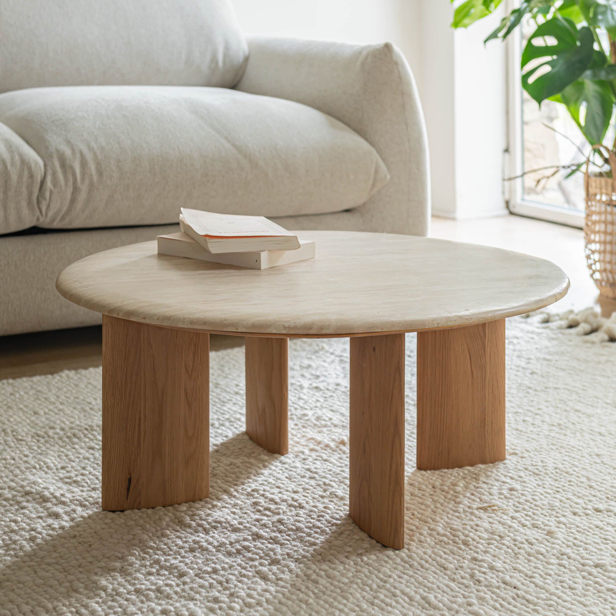 ESTEVE - Table basse ovale en travertin et bois L80xl72,5xH32cm - beige